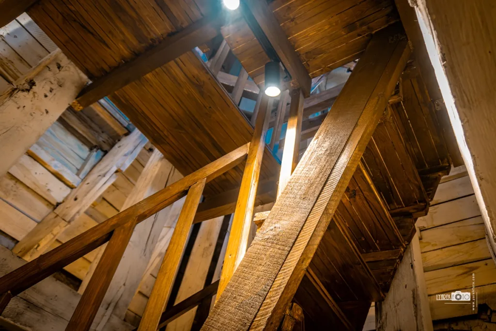 І ось нарешті йдемо туди, заради чого власне і розпочали усю цю історію. Скажу так: Львів отримав ще одну цікаву оглядову локацію, яку таки варто відвідати. Підйом на вежу здійснюється по вузьких дерев’яних сходах минаючи декілька поверхів, які працівники Будинку стилізували під музей. Тут можна побачити старі публікації про Будинок органної музики, афіші, старі списані музичні інструменти і навіть стару відпрацьовану манулу та фрагменти труб органу.