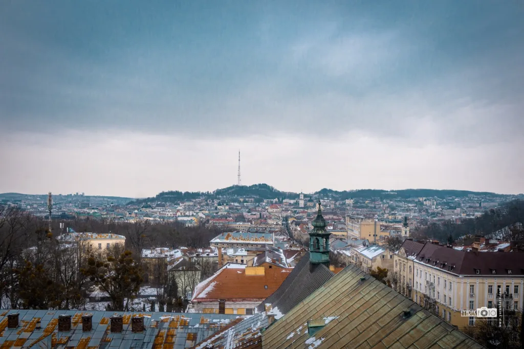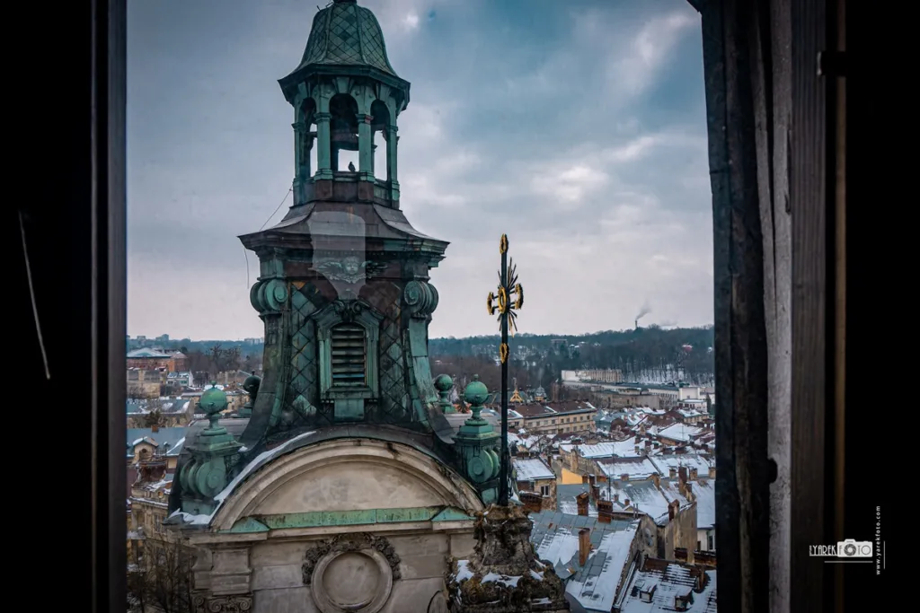 Скажу підйом складається з трохи більше ніж сотні східців і він врази легший ніж підйом на Львівську Ратушу. Завершується ваше сходження невеличкою кімнаткою з чотирма вікнами на усі 4 сторони світу. Спочатку визнаю був трохи розчарований. Проте коли зазирнув у вікно зрозумів що не варто. Так, сфотографувати об’ємну панораму не дуже той вийде. Точніше вийде при наявності відповідної оптики та фотографічних навиків, проте сам вид ставить крапки надії і розбиває усі сумніви та розчарування. Тут відкривається чудовий вид на Львівську Ратушу та Високий Замок, тут пречудовий вид на Храм Святого Юра, тут просто фантастичний вид на вулицю Чупринки, а також на сусідню вежу костелу. Навіть незважаючи на те що мій візит був у похмуру зимову погоду – свою порцію адреналіну отримав сповна.