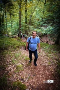 Звертаємо на Цісарську Дорогу, яка збудована австрійською владою в обхід річки Стрий, проїжджаємо повз знаменитий Трикутник Кохання, де секс найякісніший та найкращий у світі, і ось ми вже на місці. Микола має важчий та легший маршрути на скелі залежно від погоди, від кондиції туристів та від їхнього бажання. Але обов’язковим пунктом програми є сфотографуватися на фоні скель, залізти в печеру, вдихнути не просто свіжого, а божественного цілющого ямельницького повітря в Пищику.