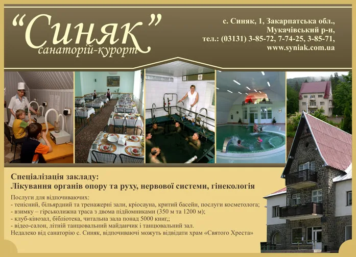 Головним лікувальним фактором курорту є Синяцька сірководнева вода, синюватий відтінок якої і обумовлює назву санаторію «Синяк». Але, звичайно, не в кольорі справа, а у цілющих властивостях тутешньої мінеральної води, чимось подібної до сочинської Мацести. Оздоровниця розташована у чарівному куточку лісистих Карпат на висоті 420-450 м. над рівнем моря. З метою забезпечення повноцінного лікування лікувальний корпус збудований у швейцарському стилі , що створює умови для якісного і, в той же час, гнучкого графіку прийому хворих. Він обладнаний сучасною медичною апаратурою, лабораторною технікою. В Санаторію «Синяк» доброзичливий, ввічливий коллектив професіоналів – від покоївки до лікаря, які щомиті готові Вам допомогти і зробити Ваш відпочинок приємним.